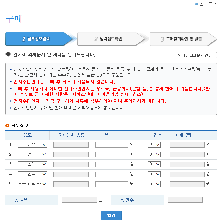 매수하는 부동산의 매매가에 해당하는 인지세를 금액 란에 입력해 주시고, 건수는 (특별한 경우가 아니라면) 1을 입력해 주세요. 그리고 하단에 있는 확인 버튼을 클릭합니다.