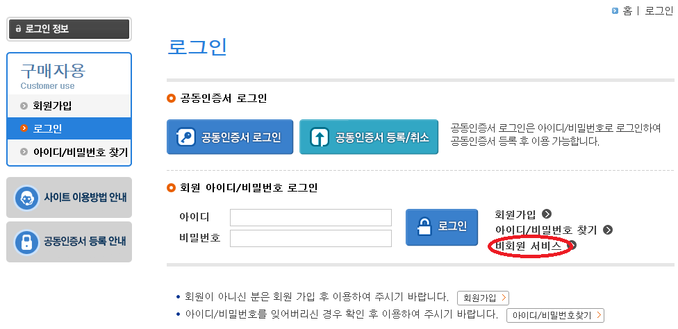 그러면 로그인하라는 화면이 뜹니다. 업무상 전자수입인지를 자주 사용하는 분이라면 회원가입을 하는 것도 좋습니다. 하지만 가끔 등기할 때만 쓰신다면 굳이 가입을 할 필요는 없을 것 같습니다. 저도 가입하지 않고 비회원 서비스로 이용했습니다. 이미 가입하신 분들은 로그인을, 가입하지는 않았지만 앞으로 자주 이용할 것이라고 생각되면 회원가입을 하시구요. 저처럼 자주 이용할 것 같지 않으면 비회원 서비스를 클릭해 주세요.