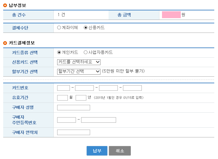 저는 신용카드를 선택했는데요. 그러면 아래와 같이 신용카드의 정보를 입력해야 합니다.