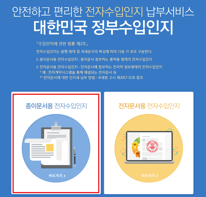 그러면 아래 캡쳐화면과 같은 홈페이지로 접속됩니다. 이 중에서 왼쪽에 있는 종이문서용 전자수입인지를 클릭합니다.