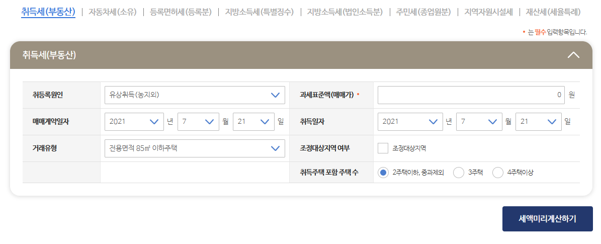 - 조정대상지역여부 : 취득하고자 하는 주택이 조정대상지역 내에 있으면 체크