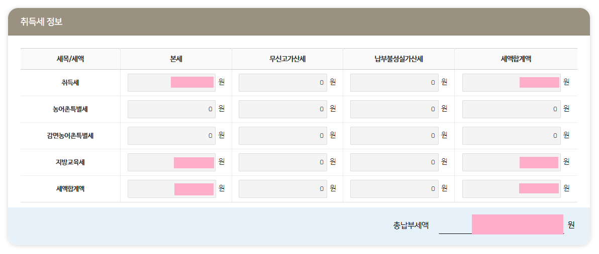 그 아래로 화면을 내려보면 취득세 정보라는 표가 새로 생겼습니다.